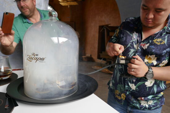 Dann gibt es kleine Häppchen, um das Aroma des Rums noch zu unterstreichen. Und ganz spannend wird es, als er die Gläser auch noch mit seiner speziellen Apparatur räuchert. Alles in allem eine sehr gelungene Degustation.