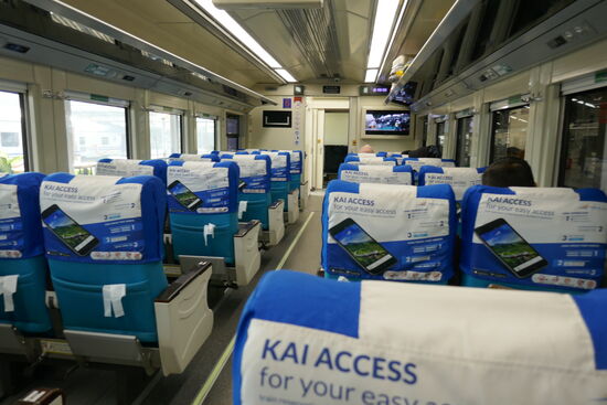 Wir haben beide Beinfreiheit und einen ausklappbaren Fußtritt. Im Zug gibt es Stewardessen/Stewards, die immer mal wieder vorbeischauen und aus dem Nachbarwagon, Kaffee, Nasi oder Bami Goreng anbieten. War beides gar nicht mal schlecht. Also wie überall in Asien muss man auch hier kein Hunger leiden.