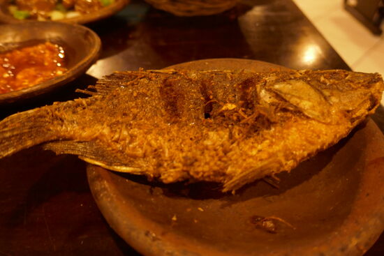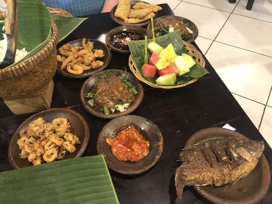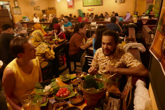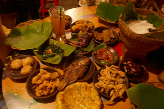 Da wir nicht so gerne Pizza und Pasta in Indonesien essen möchten, haben wir uns mit Salim in einem seiner Lieblings-Warungs im Special Sambal verabredet. Das bestellen hat Salim übernommen, man stellt sich das so vor, wie bei spanischen Tapas, man bestellt, was man mag und ruckzuck ist der ganze Tisch mit kleinen Leckereien ausgefüllt. Wir essen traditionell mit den Fingern.