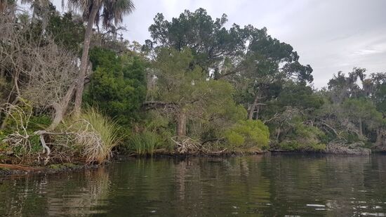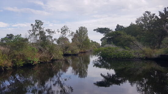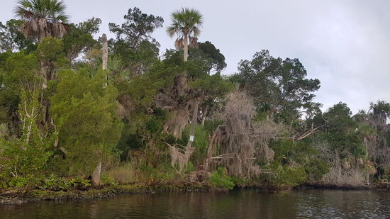 Heute möchte ich eine Runde direkt von der Unterkunft aus paddeln. Die Idee zu dieser Rundtour hatte ich von einem Kajak- und Paddelboard-Verleiher in der Nachbarschaft, der mit Ortskenntnis und Kartenmaterial behilflich war, auch wenn ich nichts ausgeliehen habe. Zunächst geht es den Homosassa River flussabwärts. Am Sonntag früh ist da noch wenig los, später wäre das wegen der vielen Motorboote ungemütlicher. Nach den letzten Häusern biege ich rechts ab. Die Bucht geht bald in einen Kanal über, der durch eine "Wildnis" führt.