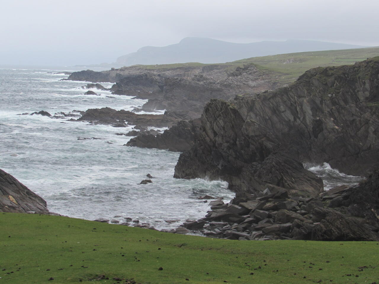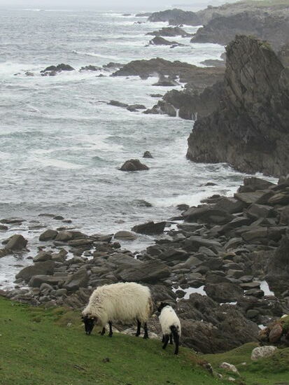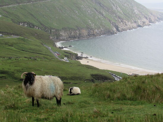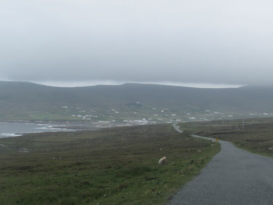In Dooega endet die Küstenstraße und wir fahren durch das bergige mit Graslandschaft bedeckte innere der Insel. Die Insel ist sehr ruhig und wirkt eher verschlafen. Kleine Orte mit weißen Häusern, eingebettet in moorigen leuchtend grünen Wiesen, das ist das Bild was einem hier gezeigt wird. Nicht zu vergessen die Schafe, die allerorts den Weg queren.