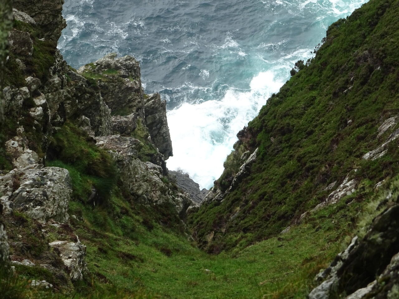 Um die Klippen zu erreichen müssen wir den westlichen Zipfel überqueren. Wir marschieren weiter über flaches, nasses Gras.