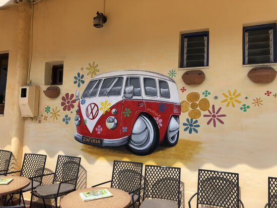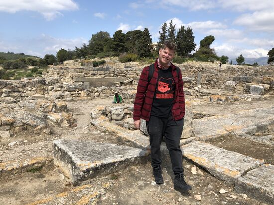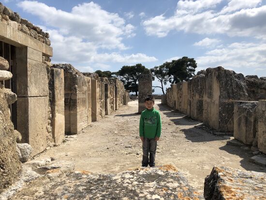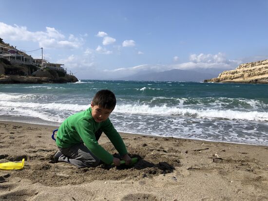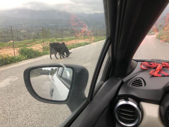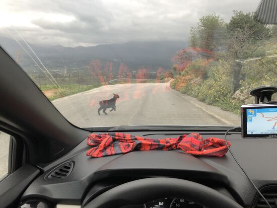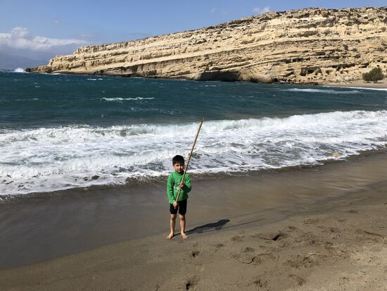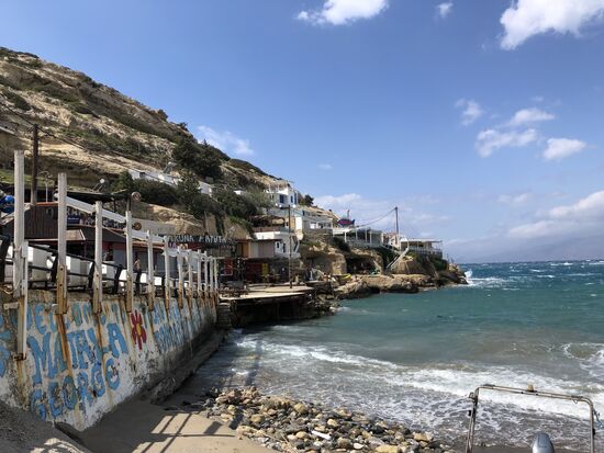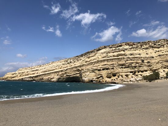 Wir merkten bald, dass man dem Regen entkommen kann. WIr checkten unsere Wetter-App und merkten, dass wenn es bei uns regnet, dass nicht heißt, dass es auf ganz Kreta regnet. Manchmal musste man in den Süden fahren um einen Gut-Wetter-Tag zu erwischen und manchmal nur einige Kilometer östlich. Die erste wirklich beeindruckende Reise machten wir mit unserem Mietwagen in den Süden an den ehemaligen Hippie-Strand von Matala. Ich fahre zwar nicht gerne Auto, aber auf den etwas kaputten Bergsträßchen, die vom Norden bis zum Süden der Insel führten machte das Fahren richtig Spaß. Die Aussicht auf Olivenbaumberge mit Ziegen, Höhlen und Tälern war unbezahlbar. Auch der Ort Matala gefiel uns sehr, allerdings gab es einen etwas starken Wind, der uns den Sand entgegenschleuderte. Auf dem Weg nach Matala machten wir Halt an 2 archäologischen Ausgrabungs-Orten: Agia Triada und Pheistos. Das gefiel uns wahnsinnig gut, da keine anderen Touristen unterwegs waren und wir herumlaufen konnten wo und wie wir wollten. Der Tag war ein tolles Abenteuer.