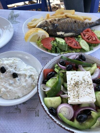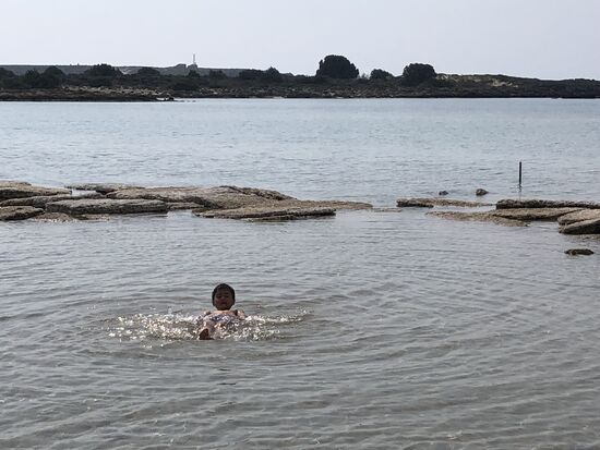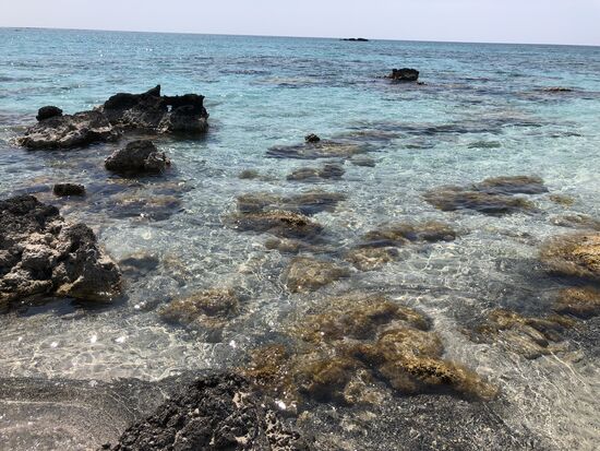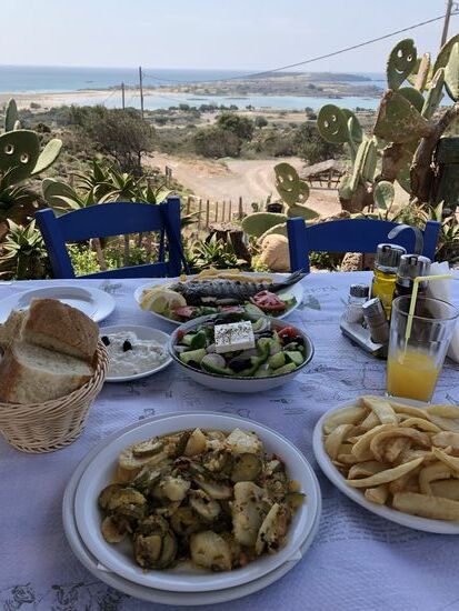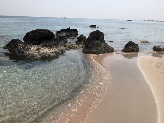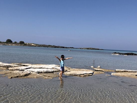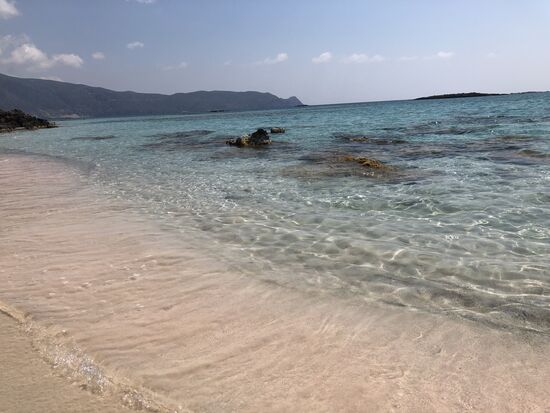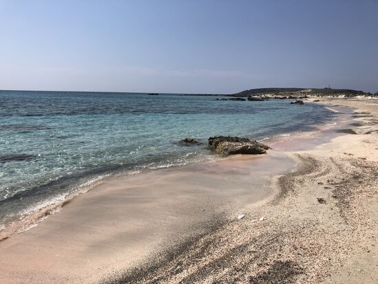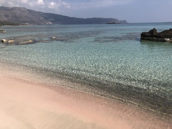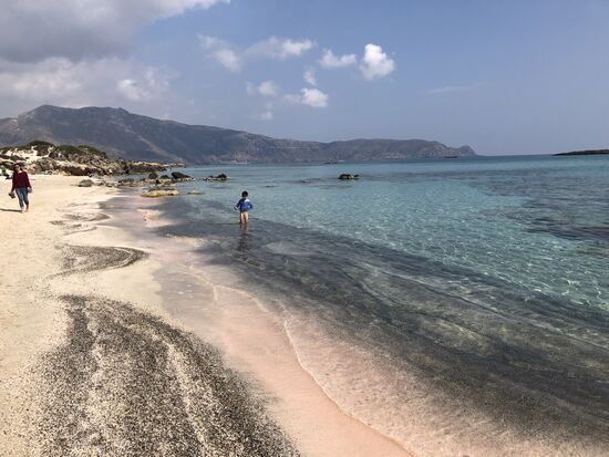 An diesem Tag konnte man zu Fuß auf die Elafonisi-Insel gehen, auf der auch seltene Seeschildkröten Eier ablegen. Das Meer hat eine türkise Farbe und der Sand leuchtet rötlich wegen der roten Muschelstücke. Und: Wir konnten an diesem Tag tatsächlich schwimmen.