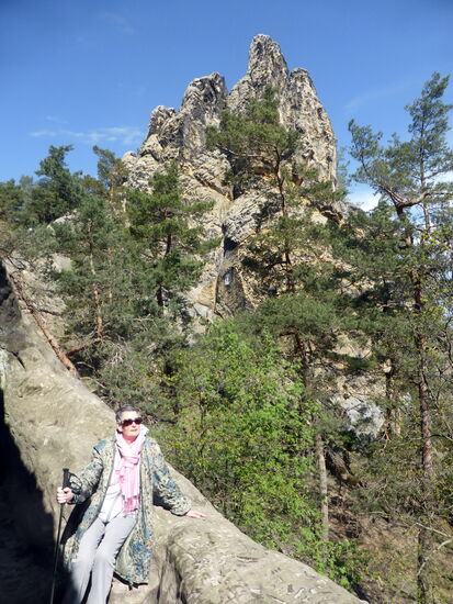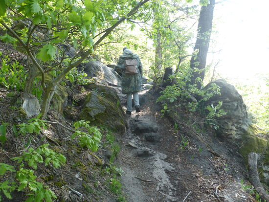 Gegen 9.30 Uhr starten wir dann zur Teufelsmauer-Tour, nachdem eine der jungen Damen der Bedienung uns verraten hat, welche der beiden Kammwege den alpinen Abschnitt enthält, der möglicherweise für unsere 'alten Knochen' Gefahren birgen könnte. Die Tour beginnt direkt an der Treppe neben dem Hotel. Es ist der nördliche, so dass wir bei unserem Aufstieg zum 'Großvater' daran denken den rechten Weg zu nehmen, der recht nah an den Felsen der Teufelsmauer vorbeiführt.