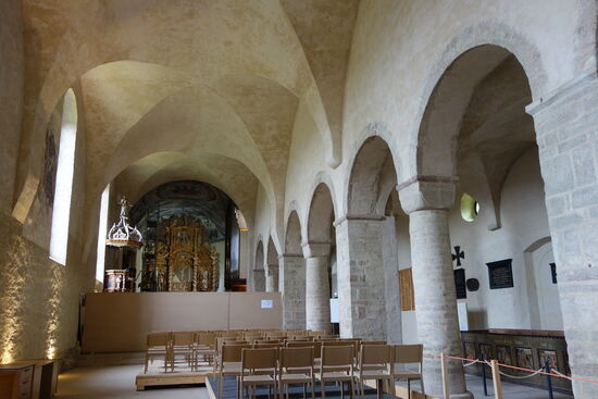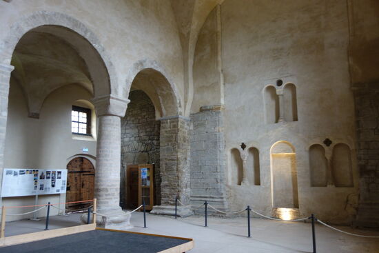 Von der 1087 geweihten Kirche sind die mächtigen Säulen des Südschiffes und Teile des Westwerkes noch vorhanden. Sie lassen die Monumentalität des damals sehr gewaltigen Sakralhaus erahnen. Als eine Besonderheit gelten die Fragmente des Fubbodens aus Gipsestrich, der im 12. Jahrhundert entstand.