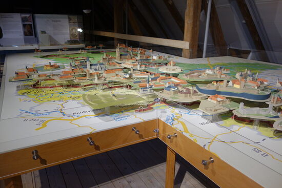 Im oberen Stockwerk über dem Kapitelsaal ist eine Ausstellung zur Strasse der Romanik – eine Arbeit auf einer riesigen Landkarte – hier sind jeweils Modelle der Klöster montiert und beschriftet. Leider kann man die pdf-Datei, die interaktiv zu bedienen ist, nicht bekommen.