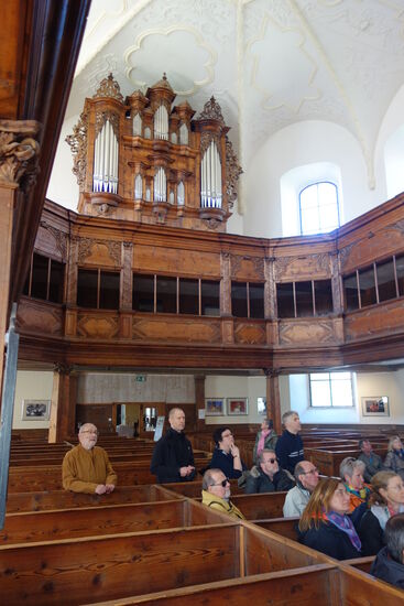 Der Innenraum wird geprägt durch die den Wänden an drei Seiten vorgelagerten, in warmen Naturholz belassenen Emporen, die auch den Orgelprospekt mit einbeziehen. Aus dem gleichen gebeizten Fichtenholz sind auch die schlichten Priechen des Langhauses.