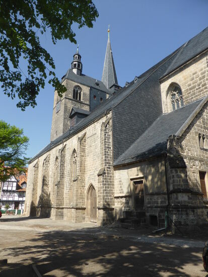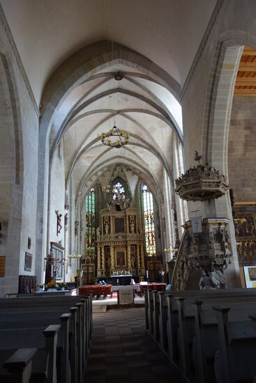 Hinter dem Rathaus erhebt sich die einst wichtigste Bürgerkirche der Stadt aus dem 13. Jh.. Zwei spätgotische Flügelaltäre, die Kanzel von 1595 und der Hochaltar von 1700 stellen bedeutende Schnitzkunstwerke dar.