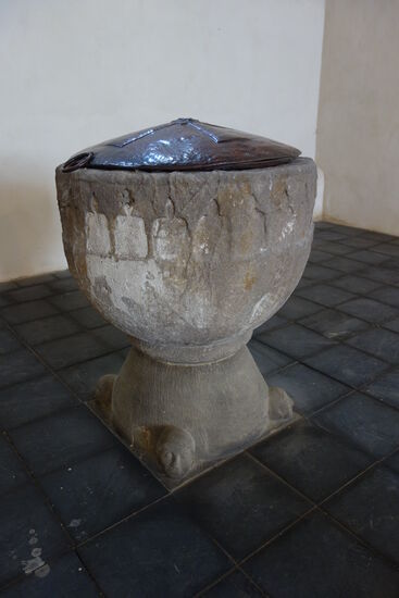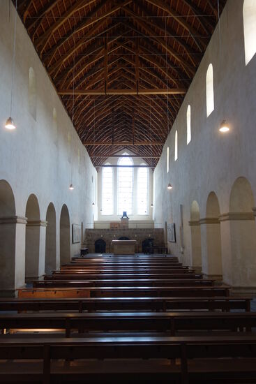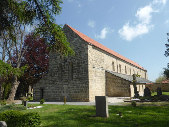 Im 13. Jh. als dreischiffige, flachgedeckte gotische Basilika neugebaut, wurde parallel der romanische Turm um ein Stockwerk erhöht.