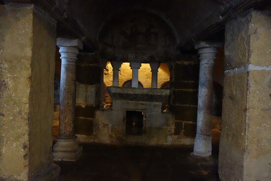 Berühmtester Teil der Kirche ist die um das Jahr 1000 erbaute Krypta, ein kleiner, dreischiffiger Raum mit niedrigem Tonnengewölbe und einem schlichten Sandsteinaltar im Zentrum. Die Seitenschiffe, von Säulen und Pfeilern begrenzt, bilden dahinter einen Rundgang. Der Raum wirkt archaisch und geheimnisvoll.