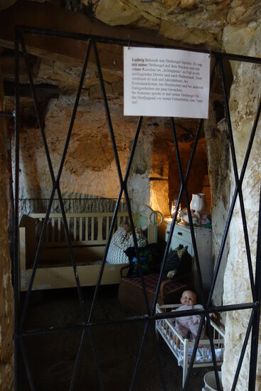 Auf der Fahrt dorthin fällt uns ein Schild Höhlenwohnungen auf, von denen Ulrike bereits gelesen hat. Wir folgen ihm und gelangen in den Ort Langenstein, wo auf dem Schäferberg tatsächlich Höhlenwohnungen offen sind. Wir fragen uns ob man hineingehen darf, denn innen ist niemand.