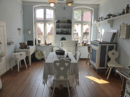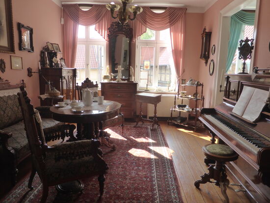 Zum Schluß besuchen wir noch das Schraubemuseum, wo im Hinterhaus eines großen Bürgerhauses eine Ausstellung vom Leben des 20. Jahrhundert zeigt. Allerdings wird im prächtigen Wohnzimmer eine private Feier veranstaltet, in die wir nicht hineinschauen sollen. Aber die Leute sind nett und wollen uns sogar zu einem Kaffee einladen.