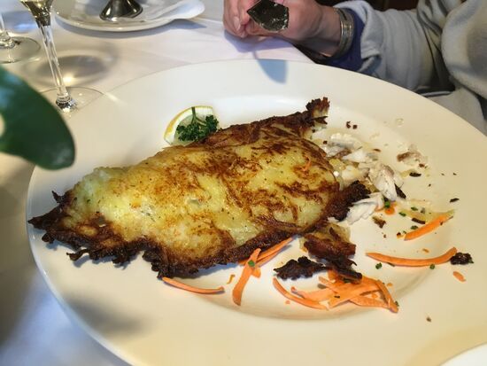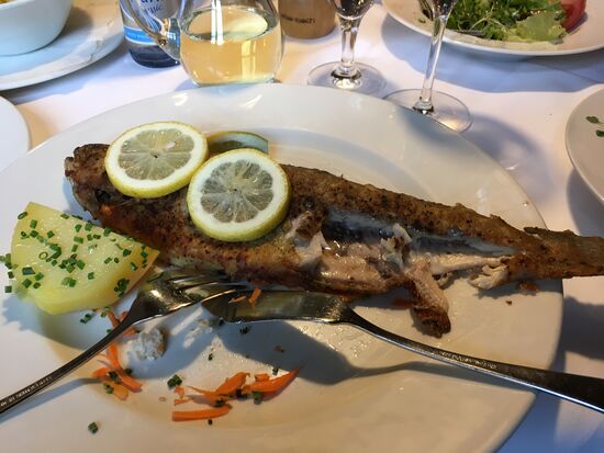 Beim Klosterfischer bestellt Ulrike ein Zanderfilet im Kartoffelmantel und ich eine Forelle Müllerin. Schließlich muß diese ja bei 120 Tonnen Fisch in den Teichen ja frisch sein. Ulrikes Zander ist mit Reibekuchenteig umhüllt, eine gute und schmackhafte Idee. Dazu reicht man eine Rosmarinbutter, die auch zu meiner Forelle sehr gut passt.