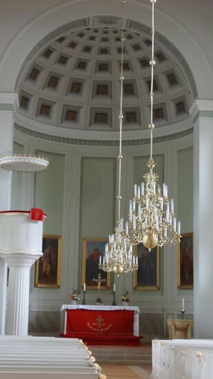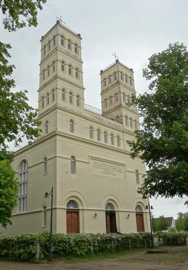 Zunächst eine kurze Fahrt nach Straupitz, schon von weither unübersehbar, die 2 Türme der "Schinkelkirche", einer evangelischen Kirche, vom Architekten Karl-Friedrich Schinkel entworfen. Die Grundsteinlegung erfolgte im Jahre 1828, am 5.8. 1832 wurde die Kirche eingeweiht und mit Kosten von ca. 30.000 Talern wurde das Budget um viele Taler überschritten, und nur durch private Gelder konnte der Bau beendet werden. Daher auch die sehr schlichte Innenausstattung. Leider war die Kirche geschlossen, nur ein Blick durch ein Türgitter war uns möglich. Mittlerweile hatte es angefangen zu regnen. Gut, dass wir unsere Kahnfahrt gestern gemacht haben.