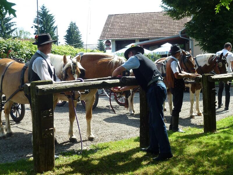 Als wir aufbrechen wollen, kommen zwei Pferdegespanne mit ihren in Tracht gekleideten Kutschern. Die Pferdchen werden direkt neben unserem Wohnmobil geparkt und freuen sich über die Äpfel, die sie von uns bekommen. Die Fuhrleute sind sehr nett, nur am sprachlichen Austausch hapert es – mangels Fremdsprachenkenntnisse.