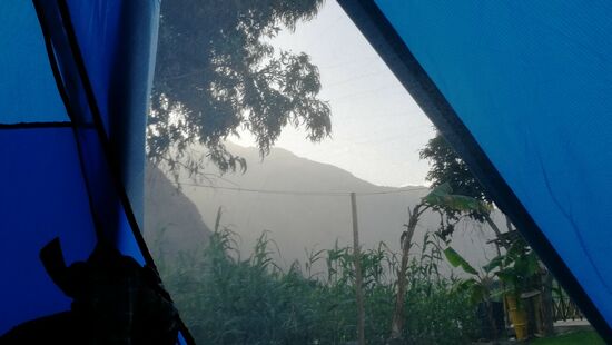 An der Plaza Mayor angekommen überfallen uns ein paar Señoras mit ihren Flyern und werben für die Restaurants und die Raftingausflüge. Später bekommen wir einen Tipp von einem Señor, wo wir ruhig und billig Zelten können. Auf dem Weg zum Campingplatz essen wir in einem netten Restaurant die lokale Spezialität: eine fritierte Forelle. Danach suchen wir den Zeltplatz Sol & Río, bezahlen 10 Soles pro Person und machen es uns in der Nähe des Flusses auf der großen grünen Wiese gemütlich. Endlich können wir unser Zelt auspacken und aufbauen