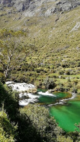 Ich schaue mir die Pflanzenwelt um uns herum an. Schaue den Vögelchen zu, wie sie sich in den kleinen Büschen verstecken. Dann betrachte ich das Schauspiel, welches der Fluss hier darbietet. Das Wasser strömt an mehreren Stellen, sucht sich stets den einfachsten Weg hinunter. Den Höhenunterschied überwindet es über kleine Stufen und bildet dabei Miniwasserfälle. Die Sonne schafft es endlich über die Felswand hinter unserem Zelt und erstrahlt das Tal. Das Wasser leuchtet nun in verschiedenen Blau- und Türkistönen. Traumhafte Landschaft!