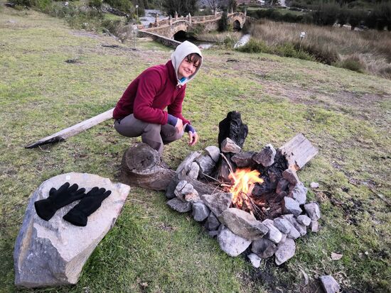 Wir entscheiden uns, noch eine weitere Nacht hier zu bleiben. Über den Tag spazieren wir durch das Örtchen, schauen uns die Gegend an und ruhen uns in der herrlichen Sonne aus. Carlos kämpft weiter mit der Höhe und der Erklärung (ihn hat es aufgrund der Höhe doppelt erwischt - warum muss eigentlich einer von uns erkältet sein, wenn wir zelten??) Am Nachmittag bereiten wir eine der vielen hinterlassen Feuerstellen vor und machen ein Lagerfeuerchen, das uns ein Weilchen etwas Wärme bei der langsam einbrechenden kalten Nacht gibt. Zum Abendessen gibt es einen Mate de Coca und ein Fadennudelsüppchen vom Gaskocher.