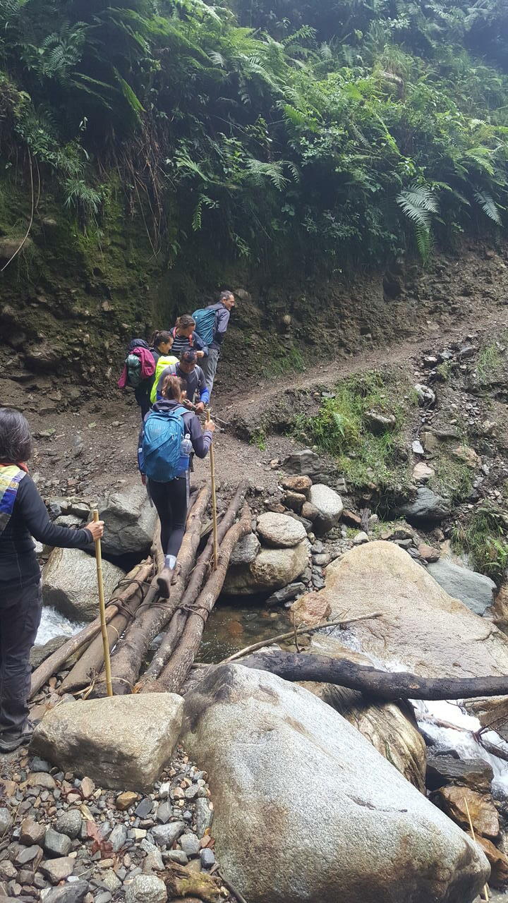 Diese Brücke am Wasserfall ist gesperrt, sodass wir daneben den Fluss über die Steine überqueren müssen.