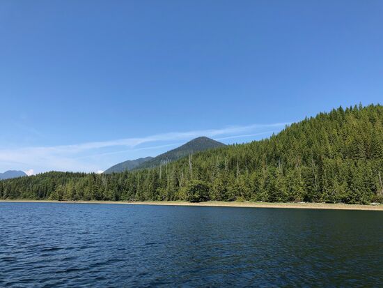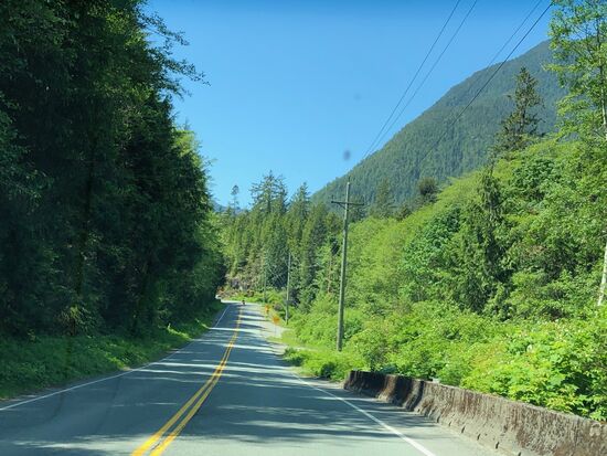 Nach ca. 30km kommt man bei "cathedral Grove" vorbei. Ein kleiner Park mit riesen Mammutbäumen und richtig Urwaldmäßig. Dort kann man ja mal einen Stopp machen. Blick auf die Rückbank, Kind schläft. Jetzt kann man sich überlegen, ob man das jetzt sehen muss oder ob man ein zufriendenes Kind haben möchte. Die Entscheidung fällt auf das Kind. Schließlich kommt man auf der Rückfahrt nochmal vorbei. Also lassen wir diesen Stopp links liegen. Jetzt geht es weiter durch die kanadische Bergwelt mit Seen, viel Wald und einer richtig schönen Landschaft.