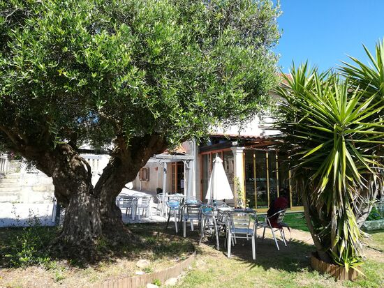 In Valbon kehre ich nach 12km in die Bar A Eira ein. Ich sitze unter einem riesigen Olivenbaum und esse mega leckeren Schinken