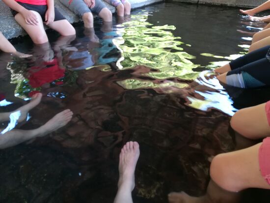 Ein Spanier sieht wie ich mir die Hände wasche. Er deutet mir den Weg in eine Nebenstraße. Dort soll ein großes Becken sein. Ich nehme den Tipp an. Kaum bin ich an der alten Waschstelle angekommen, werde ich von anderen Pilgern ran gewunken. So sitze ich mit einer ganzen Gruppe und genieße das Fußbad im angenehm warmen Wasser. Eine Wohltat für die müden Pilger Füße.