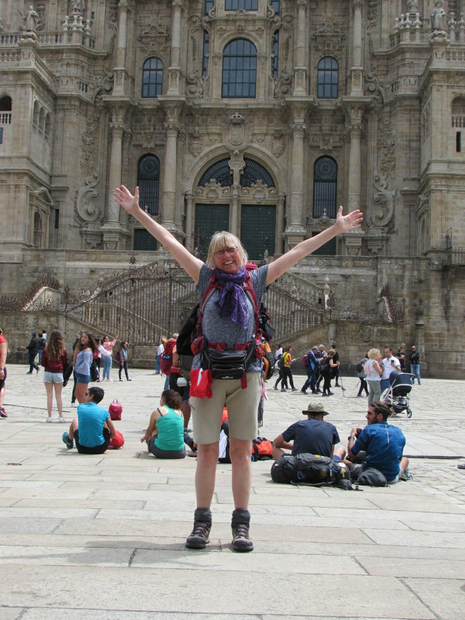 Jetzt geht es durch den modernen Stadtrand von Santiago Richtung Altstadt und die Kathedrale von Santiago de Compostela. Ich werde immer schneller und ich spüre den Schmerz in meinem Schienbein kaum noch, das Ziel zieht mich. Vor mir pilgert ein bulgarisches Paar. Wir nähern uns der Altstadt, in der viele Menschen unterwegs sind. Auf einmal die Stimme von Margit, sie hat mich erwartet. Eine freudige Umarmung und dann gehen wir Hand in Hand die schmale Gasse weiter. Plötzlich löse ich mich und laufe durch die Menge auf mein Ziel zu. Auf dem Platz vor der Compostela sind viele andere Pilger. Ich kann es kaum glauben, ich habe es geschafft - Tränen der Freude laufen. Dieser Moment ist so emotional. Ich rufe in die Menge hinein :"Bon caminho". Ich Blicke auf die Kathedrale die so mächtig und schön ist. Mein Rucksack liegt längst auf dem Platz. Margit, Scott (ein Amerikaner) und ich setzen uns auf den Platz zu den vielen anderen und ich genieße den Moment. Eine Folklore Gruppe singt und tanzt - was für ein ergreifende Erlebnis - ich bin glücklich!