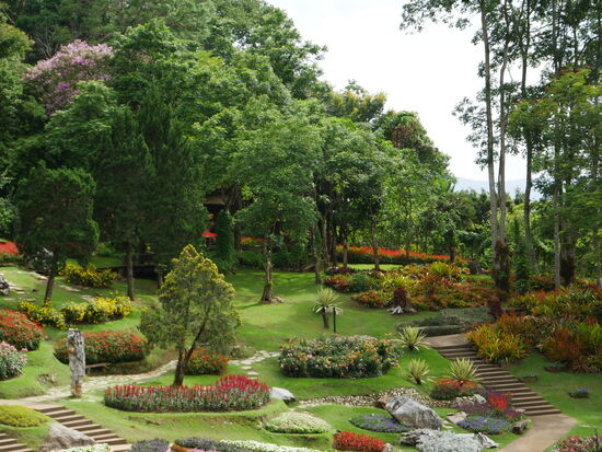 Der „Tree Top Walk“ im „Mae Fah Luang Garden“ ist der Hit. Gesichert führt uns ein wackeliger, aber sicherer Weg durch die Bäume (bis ca. 30 Meter ab Boden). Am Schluss kann man optional sogar noch „Seilbahn“ fahren, was sich sogar meine Eltern nicht entgehen lassen (ich schon, jemand musste das Ganze ja noch filmen...)! Der botanische Garten selbst ist wunder-wunder-wunderschön! Nicht genau und streng angelegt wie z. Bsp. ein Schlossgarten in England, sondern in die Landschaft eingebettet, gepflegt und trotzdem mit wilder Schönheit. So muss das Paradies sein, nicht?