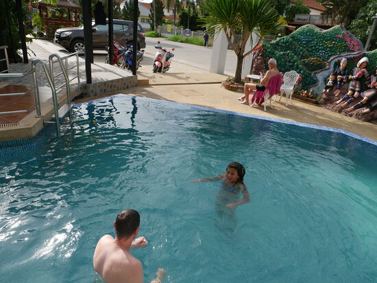 Den Rest des Nachmittags chillen wir in und am Pool. Wiederum zieht uns der Foodcourt auf dem Nachtmarkt an, wo wir an schmutzigen, rostigen Tischen (ja, das trübt das Bild des tollen Marktes und Foodcourts schon!) unser feines Essen in den Plastiktellern essen (Ja, auch das trübt! Der Abfall ist immens!).
