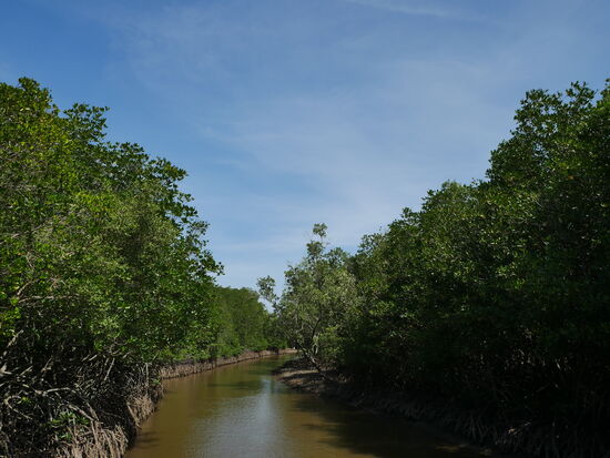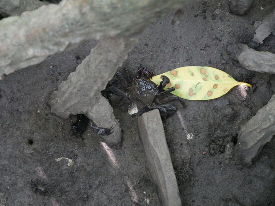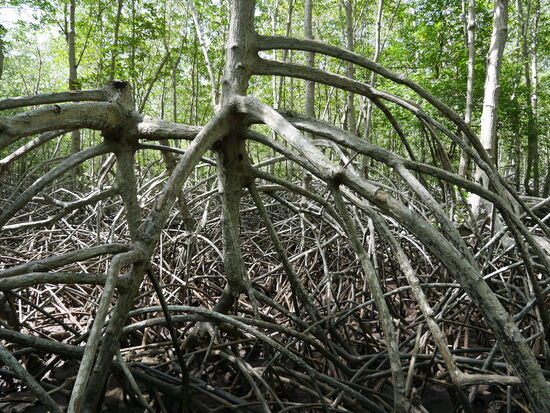 Am Nachmittag besuchten wir den Pranburi Forest Park und spazierten bobachtend und staunend auf einem Steg durch den Mangrovenwald. Was für eine urtümlich anmutende Vegetation! Da Ebbe war, stachen die Wurzeln hoch hervor; es war fast, wie wenn sie herumwaten würden. Eindrücklich auch der blank geputzte Schlick - sobald ein gelbes Blatt auf dem Boden landete, wurde es von den Krebsen gepackt und gefressen.