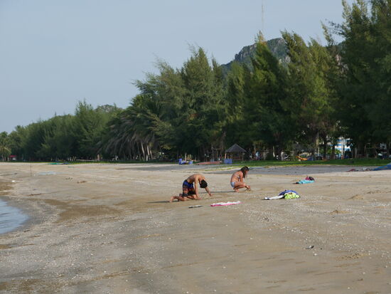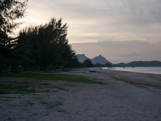 Nach gut 40 Minuten Fahrzeit waren wir in Sam Roi Beach angekommen und bezogen einfache, kleine Hütten hinter der wenig befahrenen Strasse, die uns vom Meer trennte. Wenig später waren wir in unseren Badekleidern und genossen die Spätnachmittagsstimmung am menschenleeren, flachen, relativ sauberen Strand.