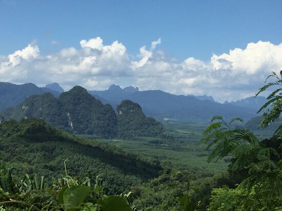 Die Fahrt durch die schöne Landschaft Südthailands entschädigte uns um ein Mehrfaches. Üppiger, dichter Wald, Palmen, Wasserläufe und kurz vor dem Khao Sok NP der Blick auf das unter uns liegende Tal mit den fast senkrecht aufragenden, dicht bewaldeten Limestone-Felsen und Wald, so weit das Auge reicht (Grosser Wow-Effekt bei meinen Eltern!).