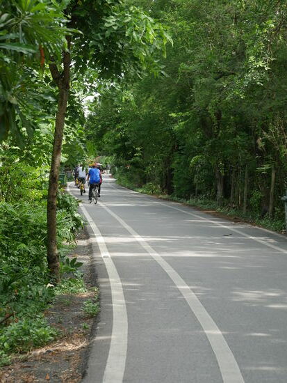 Auf „Bang Krachao“ angekommen, mieteten wir sechs schicke Fahrräder und fuhren los. Herrlich ruhig war es, auch wenn diese Flussinsel rundum von der Stadt umgeben ist. In der Stadt selbst möchten wir natürlich nicht Fahrrad fahren müssen...!