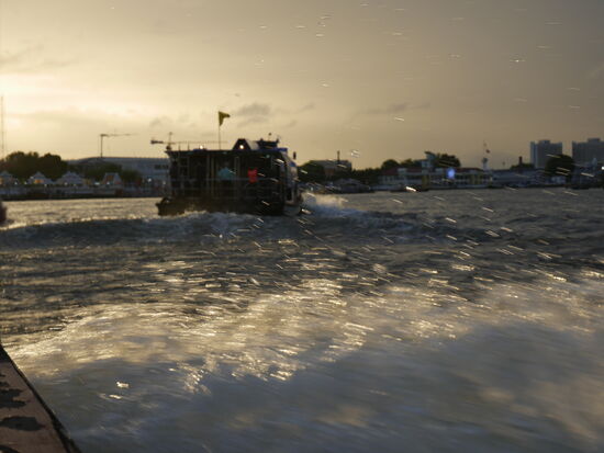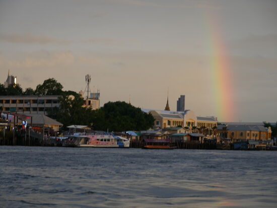 Bei der Rückreise gelangten wir in die Rushhour - Stau auf der Strasse und ein Gedränge im Skytrain. Die Bootsfahrt zurück ins Gästehaus war herrrlich. Der „kühle“ Abendwind tat dem aufgeheizten Körper gut und die goldene Sonne hinter dunklen Wolken zauberte ein wunderbares Licht auf die Gebäude.
