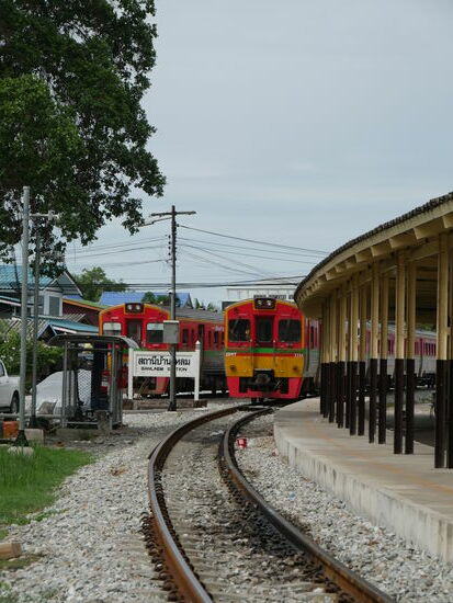 Auf dem Weg zum Markt passierten wir eine Stadt nahe der Einmündung des Chao Phraya ins Meer. Der komfortable Minibus lud uns dort aus. Auf dem Fischmarkt wurde frischer Fang ausgeladen und auf Eis präsentiert. Tintenfische, Krebse und viele grosse Garnelen. Der Duft war, na ja, etwas streng.... Nachher ging es mit der Bahn vom kleinen Bahnhof aus weiter nach Samut Songkhram. Eine Stunde fuhren wir im klapprigen Zug bei offenen Fenstern durch flaches Land, wo entweder Salz getrocknet oder in tieferen Becken Shrimps und Fisch gezüchtet wird. Dann fuhren wir in die kleine Stadt ein und 100 Meter vor dem Bahnhof wurden eilig die Marktstände zurückgeschoben und die Verdecke hochgeklappt. Unzählige Touristen standen neben den Gleisen, fotografierten, winkten und grüssten. Im Bahhnof war ein riesiges Gedränge. Phu, nur schnell raus! Unser Führer, ein alter Thai, der gut deutsch sprach, jedoch schlecht zu Fuss war, führte uns zielsicher durch den Markt zu den Gleisen. Rollenwechsel! Jetzt standen wir an einem guten Platz und zückten unsere Kameras, als der Zug mit durchdringendem Pfeiffen durch den Markt fuhr. Dasselbe Spiel nochmals: Marktstände nach hinten schieben, Wetterverdecke hochklappen, Zug durchfahren lassen, dann ruhig und zugleich flink alles wieder zum Gleis bringen - das ist der Alltag der Marktleute. Zum Glück fährt dieser Zug nicht oft dort ein und aus, nur etwa 4 x pro Tag.