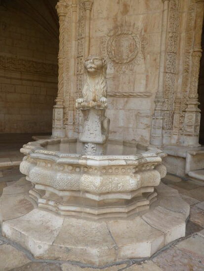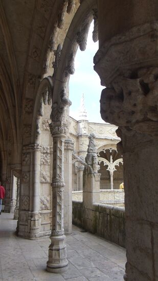 Der Kreuzgang an der Nordseite des Klosters ist ebenfalls ein Juwel portugiesischer Baukunst. Im Dekor der 26 Gewölbefelder, die ein Quadrat von 55 m umfassen, verbinden sich Elemente aus dem Abendland, dem Orient und Fernost. Aus dem gelblichen Kalksandstein wurden Embleme, Figuren, Porträts sowie stilisierte Pflanzen und Tiere herausgearbeitet. Dazwischen tauchen immer wieder das Kreuz der Christusritter, die Sphärenkugel und das königliche Wappen auf versinnbildlichen den religiösen und den weltlichen Machtanspruch des portugiesischen Königshauses unter Manuel I. Bis zur Umwandlung des Klosters in ein Waisenhaus im Jahre 1834 befand sich in der Mitte ein Wasserbassin mit dem Löwenbrunnen, der heute in der Nordwestecke steht. (Wikipedia)