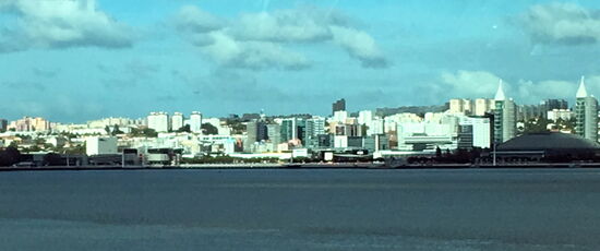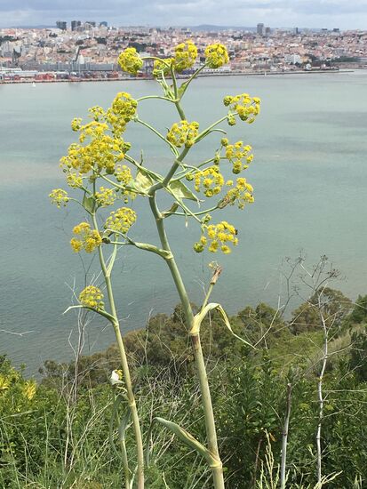 Von der Plattform hat man einen tollen Blick auf Gesamtlissabon. Links von der Brücke des 25. April kann man den Torre de Belem, das Seefahrerdenkmal und das Hieronimus-Kloster sehen. Rechts in der Ferne liegt dann das zentrale Lissabon mit dem großen Platz am Hafen und der Festung San Jorge. Die Pflanze im Vordergrund identifiziert meine App als wilden Fenchel.