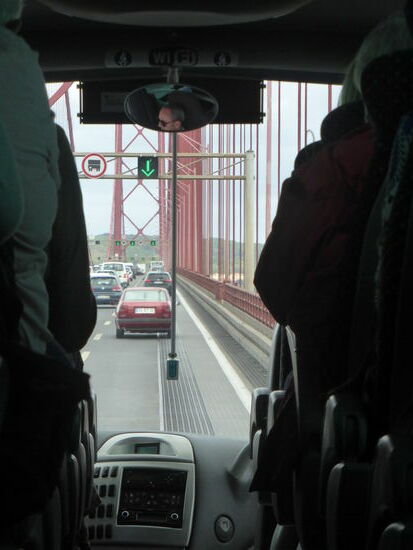 Heute kommt Joke, unser reguläre Reiseleiterin, eine junge Frau aus Flandern mit dem typischen Sprachduktus der Niederländer. (sie verschlucken das End-n) Sie hat das offizielle Programm umgedreht und startet um 8.30 Uhr die Tour zur südlich von Lissabon liegenden Halbinsel von Setubal, wo wir in Aceitao eine Keramikwerkstatt besuchen. Es geht über eine 17 km lange (sagt Joke) Brücke (eigentlich ist so nur 12.3 km lang) über den Tejo, der hier eine riesige Bucht bildet. Ihr Name ist Vasco da Gama Brücke.