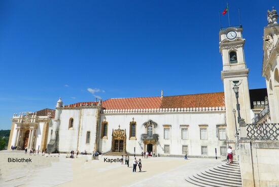 Auf dem Platz führt an der Nordseite eine elegante Freitreppe zu den Arkaden der sogenannten Via Latina, die dem Palast im 18. Jahrhundert angefügt wurde. Die Aula war ursprünglich der Festsaal des Palastes, er wurde im 16. Jahrhundert neu geschaffen und im 18. Jahrhundert unter João V. umgestaltet. Der große Uhrturm am Ende des Säulenganges in der Nordwestecke des Platzes, ebenfalls aus dem 18. Jahrhundert, ist ein schönes Beispiel für den spätbarocken Joanino-Stil aus der Zeit João V.