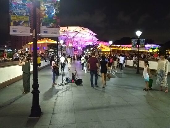 Mit der MRT bis Clarks Quay gefahren und dann das letzte Mal am Singapur River den Abend genossen. Es war Sonnabend, auf der Brücke am Riverpoint gab´s Livemusik und im kleinen seven-eleven im Riverpoint gab´s sogar kleine Flaschen Wein zu vertretbaren Preisen, so dass wir noch ein Weilchen auf der Brücke gesessen haben mit einem Weinchen dazu...das hatte was als Urlaubsausklang.