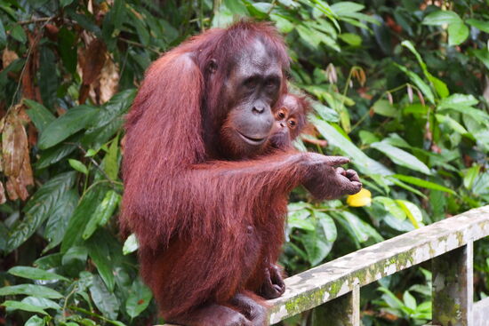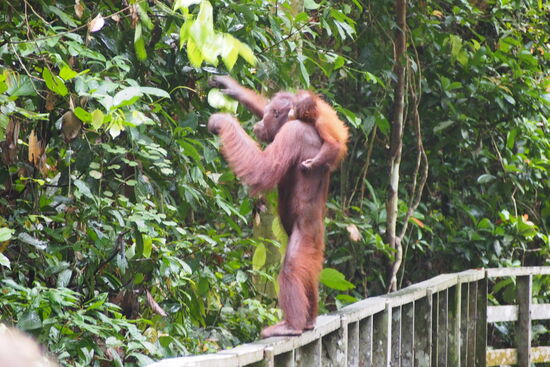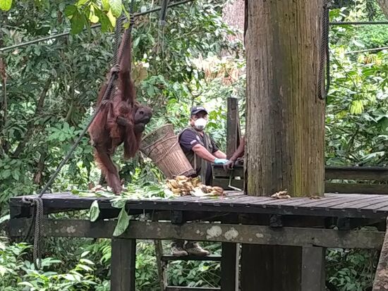 Wer nach Sepilok reist, möchte ins Orang-Utan-Rehabilitationszentrum.. Die Fütterungszeiten 10 und 15 Uhr sind die Hauptbesuchszeiten. Wir sind die 5 km hingefahren, reichlich viele Leute. Eintritt zu dritt mit Kamera 85 RM.
