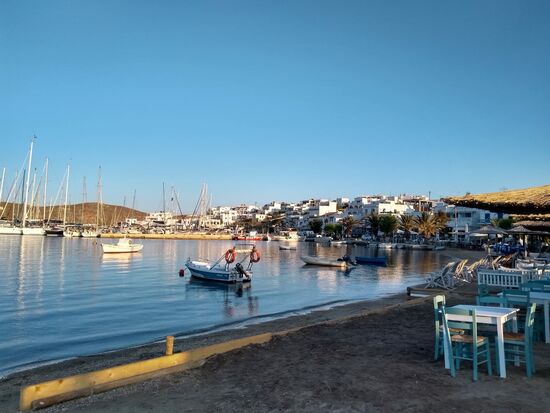 Aber der Blick bei der Einfahrt in den Hafen von Serifos ist immer noch der gleiche, einfach fantastisch: Die weißen Häuser der Chora auf dem karstigen Berg klammern sich oben an die Steilwand und im Hafen spiegeln sich die weißen Segelboote im tiefblauen Meer in der Abendsonne. Die wenigen Menschen die hier die Fähre verließen, verweilten etwas um das schöne Bild zu genießen.