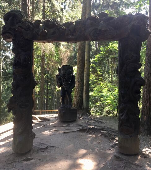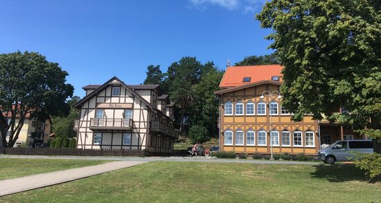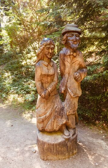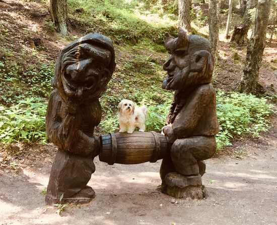 Heute kleiner Rundgang in unserem Ort Juordkrante, der älteste Ort auf der Nehrung. Ein wenig im Schatten von Nida steht der zweitgrößte Ort im litauischen Teil der Nehrung. Dabei ist Juodkrantė (deutsch: Schwarzort) legendär: In der zweiten Hälfte des 19. Jahrhunderts wurden hier Unmengen an Bernstein abgebaut. Bunte Fischerhäuschen und schmucke Holzvillen prägen das Bild des Fischerdorfes. Die neu gestaltete Promenade lädt zum Flanieren am Haff ein. Im angrenzenden Park werden Skulpturen litauischer Künstler ausgestellt. Auch der Hexenberg (Raganu kalnas) von Juodkrante ist einen Besuch wert. Deswegen schauen wir uns das mal an. Man wird auf einem Rundweg in die litauische Märchenwelt entführt: 82 hölzerne Figuren verkörpern Sagen- und Märchengestalten.