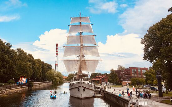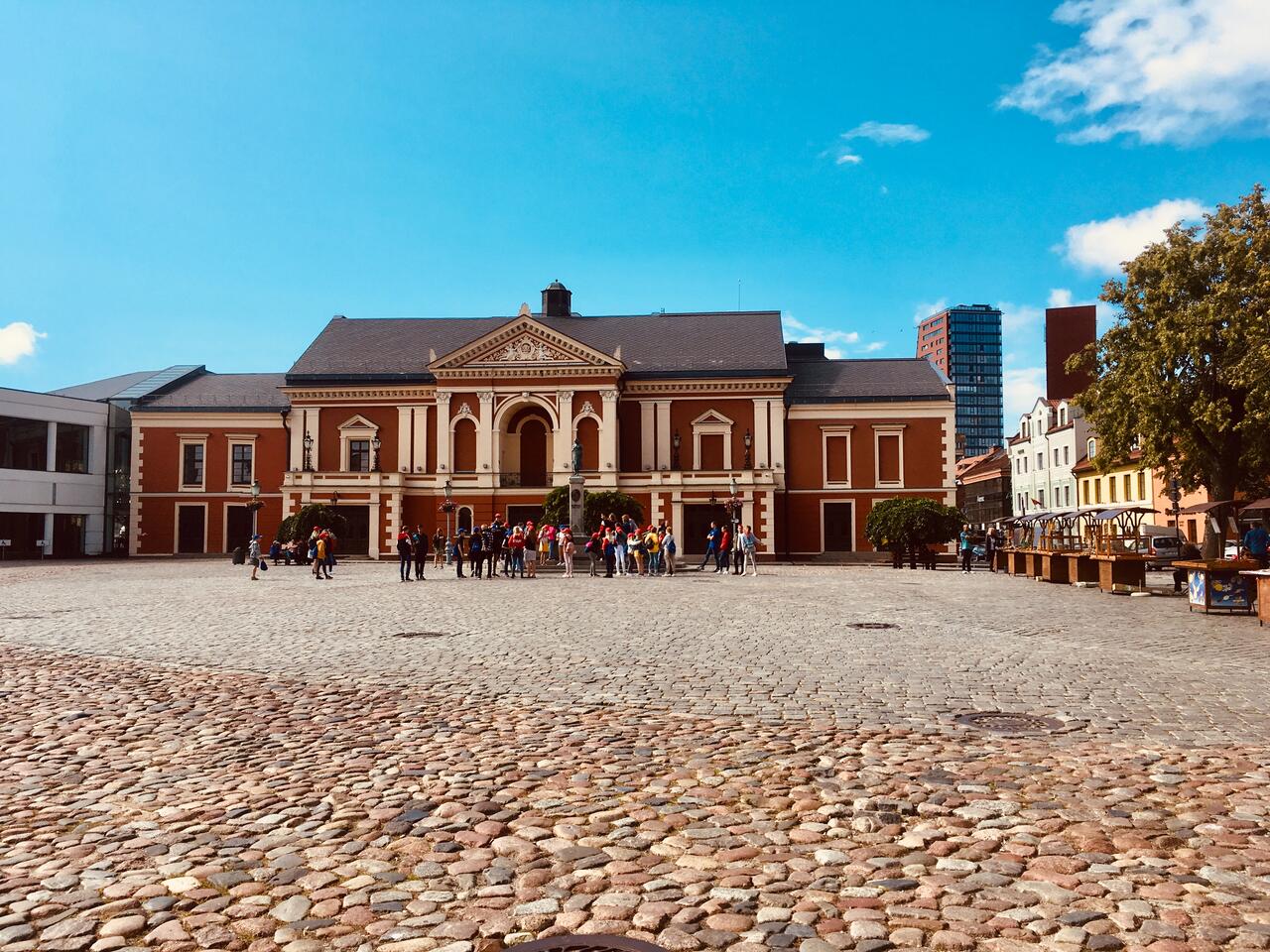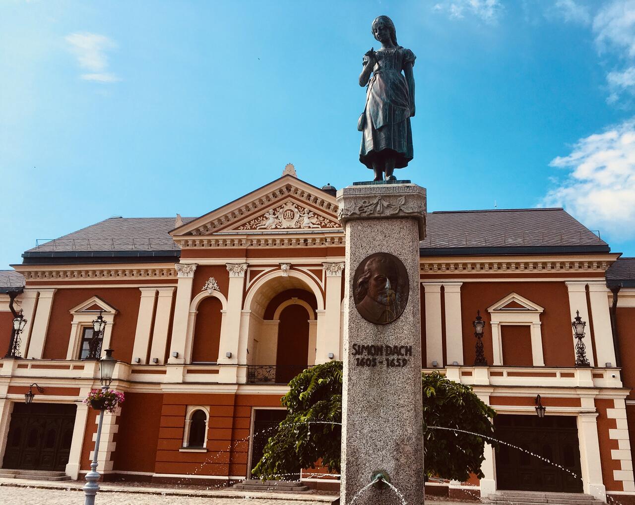 Theaterplatz mit Wahrzeichen den in Klaipeda geborenen Dichter Simon Dach. Die Hauptfigur des Denkmals ist Ännchen von Tharau die Heldin seines bekanntesten Gedichtes, das später zum Volkslied wurde.