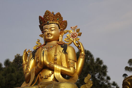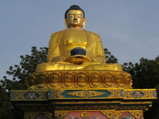 Einst war das ganze Tal von Kathmandu ein großer See. Eines Tages entdeckten Sadhus eine Lotosblüte auf der Oberfläche des Sees. Über Jahrhunderte pilgerten Gläubige an die Ufer des Sees und verehrten die Lotosblüte als Symbol Gottes. Eines Tages stieg eine leuchtende Flamme aus dem Lotoskelch, Swayambhunath entstand oder besser gesagt erschuf sich selbst – so sagt es sein Name: Der aus sich selbst erstandene Gott. Die Manifestation des Buddha leuchtete noch viele weitere Epochen, bis der Bodhisattva Manjushri aus China nach dreimaliger Umrundung des Sees eine Schlucht in die südliche Hügelkette schlug und mit dem Abfluss des Wassers auch die Flamme verschwand. Die blauleuchtende Lotosblume pflanzte er auf den Hügel von Swayambhunath.