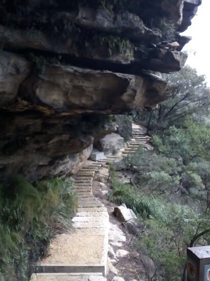 Treppen führen durch das „Tal der Wasser“, schmale Pfade hangeln sich entlang der Steilklippen oder werden wie Tunnel durch sie hindurchgebohrt. Am Ende geht es wieder über Treppe entlang der Wentworth Falls nach oben.