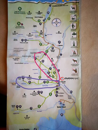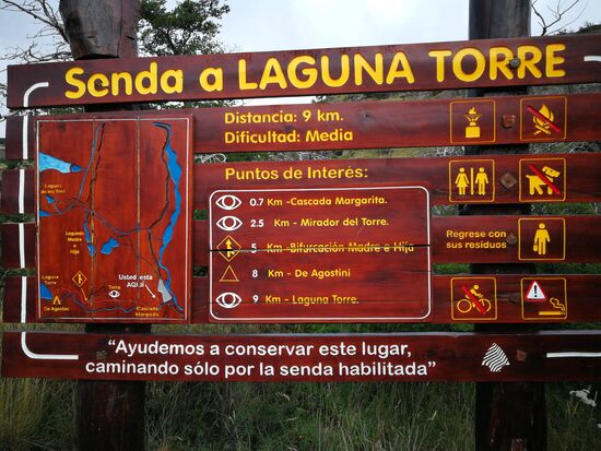Wir wählten den zum Cerro Torre und der Laguna Torre, der mit 9 km einfach angegeben war. Im Falle guten Wetters ließen wir uns zudem die Option auf einen kurzen Umweg zur gestrigen Tour.