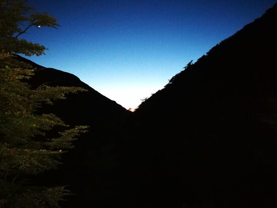 Nach rund einer Stunde unterwegs zog allmählich die Dämmerung herauf. Zaghaft zeichnete sich erste Landschaft grauschwarz vor uns ab. Wir hatten von den beschriebenen 3 km des Weges nach der ersten der beiden anberaumten Stunden bereits 2 km hinter uns, was aus unserer Erfahrung am Fitz Roy nur eines heißen konnte: Ab hier sollte es beschwerlich werden.