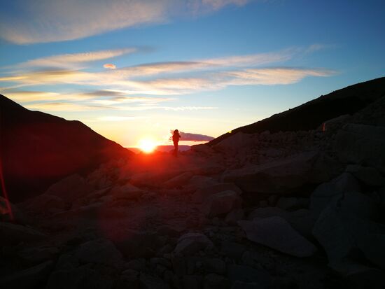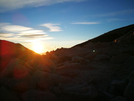 Ringsum auf den Felsen bemerkten wir nun auch ein Räkeln und Rühren. Ich vermeinte ein paar Kollegen von gestern aus dem Camp, dick eingemummelt, wiederzuerkennen. Hatten die tatsächlich hier oben übernachtet? Es war eiskalt! Unsere vom Aufstieg schweißnassen Klamotten (von wegen atmungsaktiv!) machten allmählich Anstalten, an uns festzufrieren.